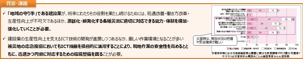 - 補助対象経費 :発災時の応急復旧を想定した防災訓練に際してのICT機器の導入経費(発災時以外の建設現場における活用等も含む)