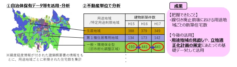 そこで緯度経度情報が付された建築概要書の情報をもとに、用途地域ごとに新築された住宅数を集計し、不動産単位で分析することで、線引き廃止前後における用途地域ごとの新築住宅数を把握することができました。