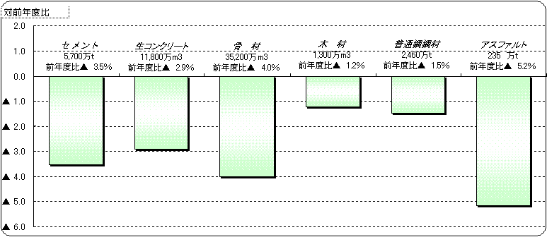 平成17年度における需要量は、セメントが対前年度比2.6%増の5,909万t、生コンクリートが対前年度比2.2%増の12,155万m3であった。平成18年度については、セメントが対前年度比3.5%減の5,700万t、生コンクリートが対前年度比2.9%減の11,800万m3と見通される。